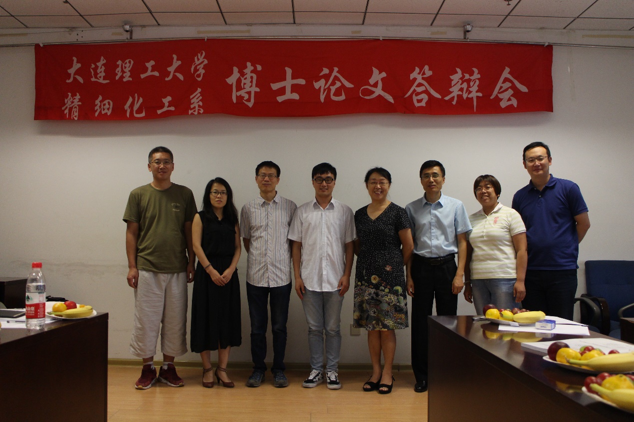 2019年9月11日本研究团队邱金晶博士的学位论文答辩会在精细化工国家重点实验室F-202举行,邱金晶博士的论文答辩题目是“弱碱性芳胺的稳定重氮盐制备及其在偶氮分散染料合成中的应用”。本次答辩委员会主席是精细化工国家重点实验室吕荣文教授。