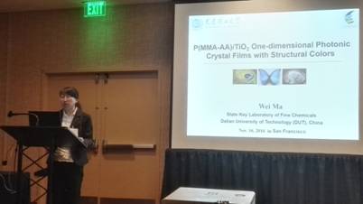 马威老师在先进结构复合材料分会上做了题为“P(MMA-AA)/TiO2One-dimensional Photonic Crystal Films with Structural Colors”的报告,展示了本课题组在结构生色材料研究的最新进展,并与与会专家学者进行了深入地交流与讨论,研究受到广泛关注,取得了预期的效果。马威老师还参加了纳米科学、聚合物等多个分会的交流。应邀参加了美国TexasA&MUniversity的招待会。通过本次学术交流,在复合材料结构设计、应用性能等方面拓宽了研究思路,为今后开展科研工作和学术交流奠定了基础。