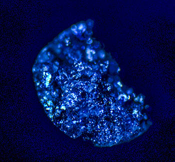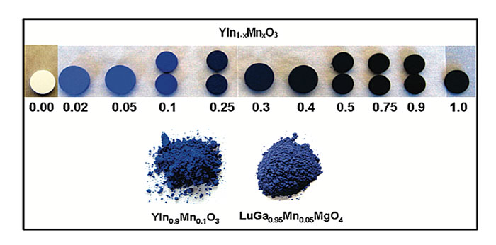 有机染料之外,无机矿物染料也是蓝色世界的一大支柱。不过发现蓝色矿物也充满了意外。俄勒冈州立大学的Mas Subramanian教授在研究电磁材料时,指导研究生Andrew Smith合成一种含铟和锰的材料。但这种由氧化铟、氧化锰和氧化钇混合加热而成的材料没有任何特殊的电磁学特性,不过它的特征也显而易见,非常非常蓝。