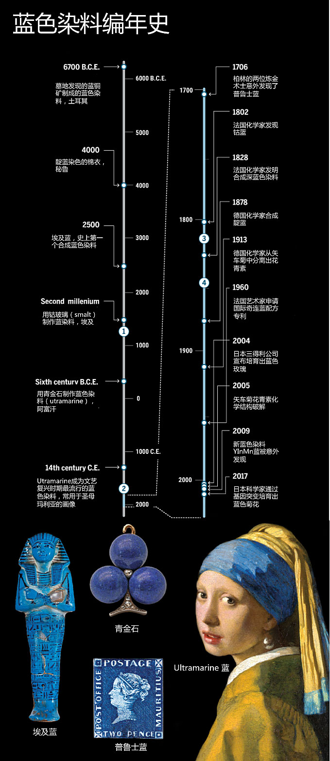 或明朗或深邃的蓝色在现代生活中似乎随处可见,但那背后藏着人类一连串的努力和意外。在众多色彩中,蓝色可能是最傲娇的一个,蓝色的花在自然界很罕见;发蓝色光的LED的直到上世纪九十年代才姗姗来迟,它的发明不仅给我们的生活带来了节能的LED灯,甚至还获得了诺贝尔奖的垂青。土耳其曾发掘出一座公元前6000年的墓地,在里面发现了蓝铜矿制成的蓝色染料,从那算起,人类对蓝色的追求已持续了近万年,而且到今天也仍在继续。科学上可以解释为什么蓝色这么罕有——呈现蓝色的染料必须吸收阳光中的红光,但我们都知道红光是可见光中能量最低的,这意味着材料中发生电子跃迁的两个能级离得很近。自然界或生物体很难形成满足这一要求的稳定物质。