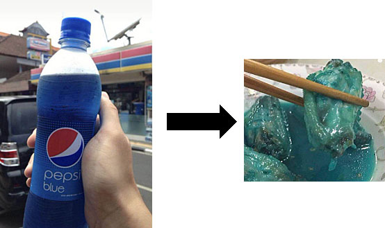不过想必还是有人喜欢的吧,不然可口可乐、百事可乐等大公司也不会投资大笔资金寻找天然的蓝色食用色素。目前可供选择的蓝色食用色素非常有限,包括合成的蓝色1号和蓝色V,以及天然的螺旋藻提取物。合成色素的优点当然很多,不过消费者追求天然成分的风潮日益流行,螺旋藻提取物在高温或照射下会很快褪色,并不能满足食品加工业的需求。蓝色花朵中的花青素或花翠素也是潜在的天然蓝色添加剂的候选者,不过它们一般在1天左右的时间内就会变色,科学家正努力在花翠素的众多衍生物中寻找安全稳定的食用色素。另一派寻找蓝色添加剂的道路更“吓人”——在黄石国家公园滚烫的温泉中或是海洋里寻找蓝色的微生物。好在目前的发现表明这些蓝色细菌产生的色素用于药物开发更合适。
