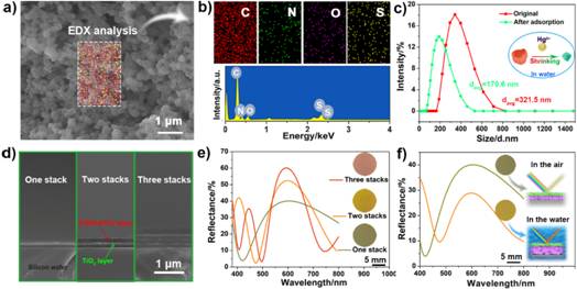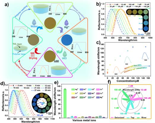 研究人员首先设计合成了含硫脲官能基的功能聚合物纳米粒子P(AM-ATU),其结构中含有丰富的汞离子识别位点,通过配位键合,可选择性捕获水环境中的汞离子。进一步通过层层自组装将P(AM-ATU)粒子与具有高折光指数的纳米氧化钛交替涂覆于基材上,得到不同堆叠周期的一维光子晶体,并通过调控材料厚度调节光子禁带位置。基于纳米粒子形成的结构孔隙,可以使被检测物快速渗透、扩散、吸附到作用位点,加速传感。研究发现,当被检测汞离子浓度一定时,光子晶体堆叠周期数越低,其对汞离子的响应灵敏度越高,检测限可达1 nM,且对汞离子具有特异性识别能力。设计了时间分辨检测方法,实现1 nM- 800 μM的宽范围检测。此外,该薄膜材料还具有出色的循环使用稳定性,不同水源的对比测试结果证明该光子晶体薄膜具有良好的实际应用价值。