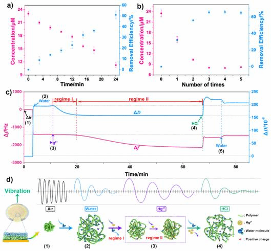 采用耗散型石英晶体微天平(QCM-D)实时监测薄膜在汞离子吸附过程中的质量和粘弹性变化,揭示了基于纳米聚合物的两阶段汞离子吸附过程原理。阶段I:光子晶体不断捕获汞离子,引发聚合物层体积不断收缩,同时伴随大量水分子的排出,薄膜粘弹性降低,而水分子的排出抵消了薄膜对汞离子吸附引起的质量增加,膜质量没有明显变化;阶段II:在薄膜对汞离子的进一步吸附过程中,其质量逐渐增加,但薄膜中聚合物链已被所吸附的汞离子“锁定”,其粘弹性几乎不变。
