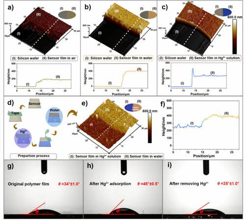 研究对比了光子晶体薄膜在空气、水和汞离子溶液中的原子力显微镜和聚合物膜水接触角测试结果。结果表明,该薄膜材料具有较强的吸水溶胀性和汞离子捕获能力,汞离子的吸附引起膜层厚度降低,从而实现光子禁带蓝移。