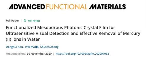 近日,大连理工大学精细化工国家重点实验室的张淑芬教授团队开发了一种结构简单,可同时实现水环境中汞离子可视化检测和高效吸附的介孔光子晶体智能膜材料。所制备的彩色光子晶体薄膜能够高效捕获水环境中的汞离子,实现汞离子的富集和水环境污染的修复。同时,汞离子的吸附触发光子晶体体积收缩、晶格间距减小,从而引起薄膜颜色的改变,实现了对水环境中汞离子的可视化定量检测。相关研究成果以“FunctionalMesoporous Photonic Crystal Film for Ultrasensitive Visual Detection and Effective Removal of Mercury (II) Ions in Water”为题,发表在最新一期的AdvancedFunctionalMaterials杂志上,论文第一作者为博士研究生寇东辉,通讯作者为该团队的马威教授。