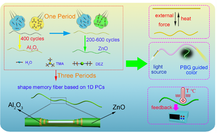 柔性光子晶体纤维在通信、生物医学、智能穿戴材料等领域广泛应用,然而,制备具有适应性、多功能、高性能的柔性光子纤维一直是一个巨大的挑战。团队牛文斌教授等通过在透明的聚酯纤维表面共轴生长Al2O3/ZnO一维光子晶体壳层,构建了新型的兼具光学和电学功能的形状记忆光子晶体光纤(SMPF)。该光子晶体光纤具有可调谐的结构颜色、各向异性的光学反射特性和优异的机械稳定性,特别是,表现出了独特的形状记忆能力。这在以前的光子晶体光纤中很难实现。得益于光子带隙和形状记忆能力,这些SMPF能够应用于光波导,引导光束沿着特定通道进入生物组织深层,用于深部组织成像和光疗等。此外,氧化锌材料的光电、热释电效应,使其可以用作形状记忆温度传感器件,用于实时动态监测口呼吸、鼻呼吸和红外光。该工作为构建柔性多功能光子纤维提供了一个通用平台,并在生物组织深部的光动力治疗、可穿戴电子器件和智能机器等领域具有广阔的应用前景。
