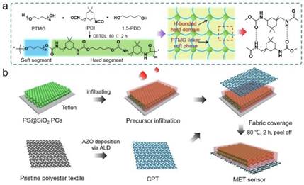 图2(a)PTIP超分子弹性体的合成及结构;(b)MET传感器的制备过程示意图