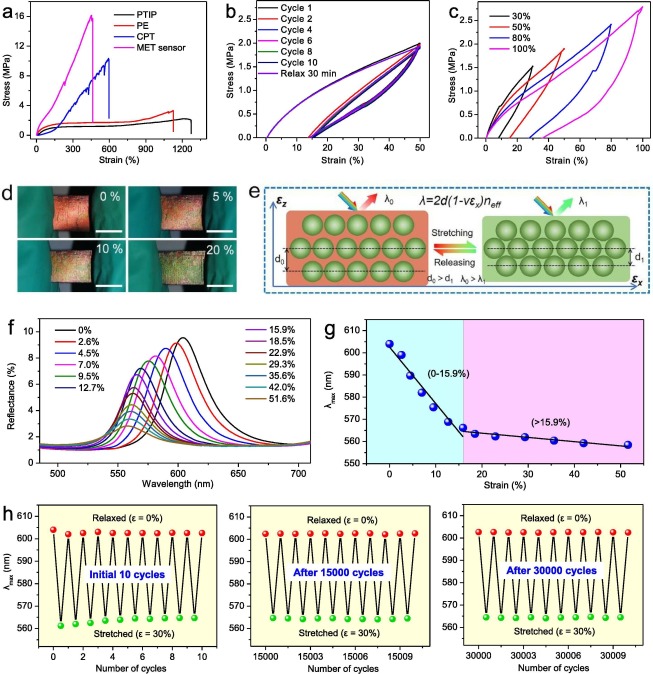 基于上述PE和CPT各自优异的光电特性,我们将二者耦合制备出一种新型的MET织物传感器。得益于其独特的半嵌入式结构,MET传感器不仅表现出明显的负电阻响应,而且在拉伸时还具有同步的力致变色能力。值得注意的是,MET传感器具有明亮的结构颜色,高韧性(35.6 kJ m-3),优异的机械弹性,快速的光电响应(0.30 s)和恢复速度(0.22 s),最重要的是,即使在3万次拉伸/释放周期后,MET传感器的结构颜色和电响应仍然保持不变,具有优异的机械稳定性、可靠性和优良的稳定性。