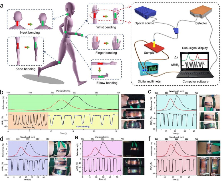 最后,考虑到MET传感器对外界应变具有同步稳定的光电双信号响应,我们进一步将它作为一种新型的可视化交互装置,其中颜色变化可由人眼直接感知并通过光谱进行量化,电信号变化可由电子仪器准确记录,从而实现了对人体各种关节运动的交互式、可视化、动态实时监测,为基于导电织物的可视化交互传感器的实现开辟了道路。