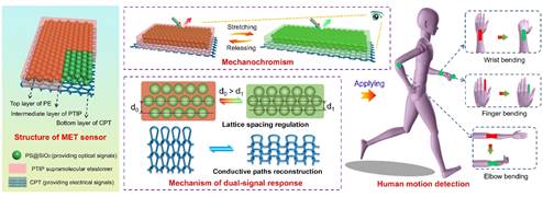 有鉴于此,团队牛文斌教授和加州大学洛杉矶分校的材料科学与工程系Ximin He教授等合作,将超分子光子弹性体和具有多层纤维结构的导电涤纶织物结合起来,合作开发设计并制备了一系列具有快速和持久的光电双响应的交互力致变色电子织物(MET)传感器,并进一步展示了它们在可视化可穿戴电子产品中的应用。