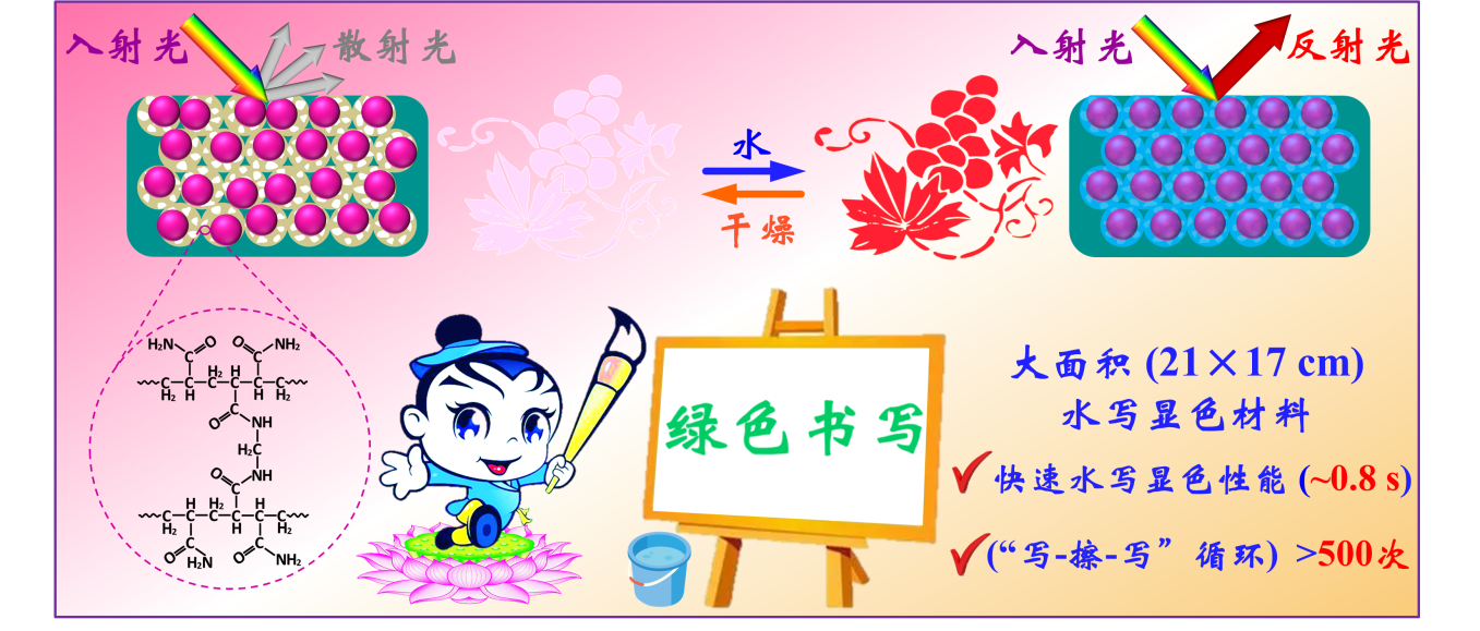 与传统纸张相比,水可重写的光子纸因其无污染、环保的特点引起了研究者们广泛地关注。然而有报导的基于水凝胶基质溶胀行为,通过调整周期性晶格常数或以软结构乳胶微球作为构建单元通过改变折射率比制备的光子纸水写显色速度较慢,因此开发环境适应性好、快速水写显色的光子纸成为当今研究的主流方向。