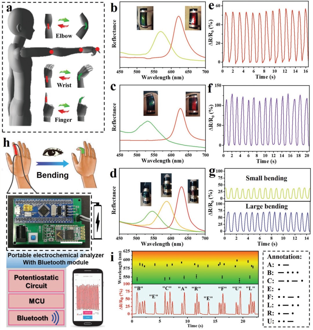 仿生PI-skin被固定在手指、手腕和肘部以监测人体关节的运动。电信号由数字电桥监测,光信号由光纤光谱仪和肉眼捕获。随着手指弯曲,PI-SKIN被拉伸,结构颜色的随即同步变化。小弯曲(≈30°)和大弯曲(≈60°)产生≈37%和≈75%的相对电阻变化,使结构颜色分别由红色显着变为黄色和绿色,表明PI-skin可胜任识别不同程度的手指弯曲。证明了仿生PI-skin在智能交互方面的独特优势。