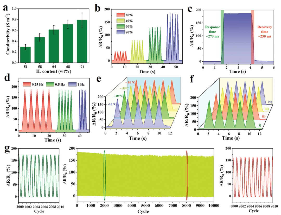 随着IL含量从51%增加到71%,PI-skin离子电导率从≈0.29增加到≈0.81 S m–1。由于高机械弹性,PI-skin表现出一系列可逆且稳定的电信号,具有快速响应时间(≈270 ms)和恢复时间(≈250 ms),可以检测不同频率的应变并输出与频率无关的电信号,证明了应变传感性能的可靠性和实用性。由于共价交联网络的稳定性,在至少10000次拉伸-释放循环中,相对电阻变化基本相同,仅显示出轻微的零点偏移,表现出PI-skin在长期使用中的卓越耐用性。