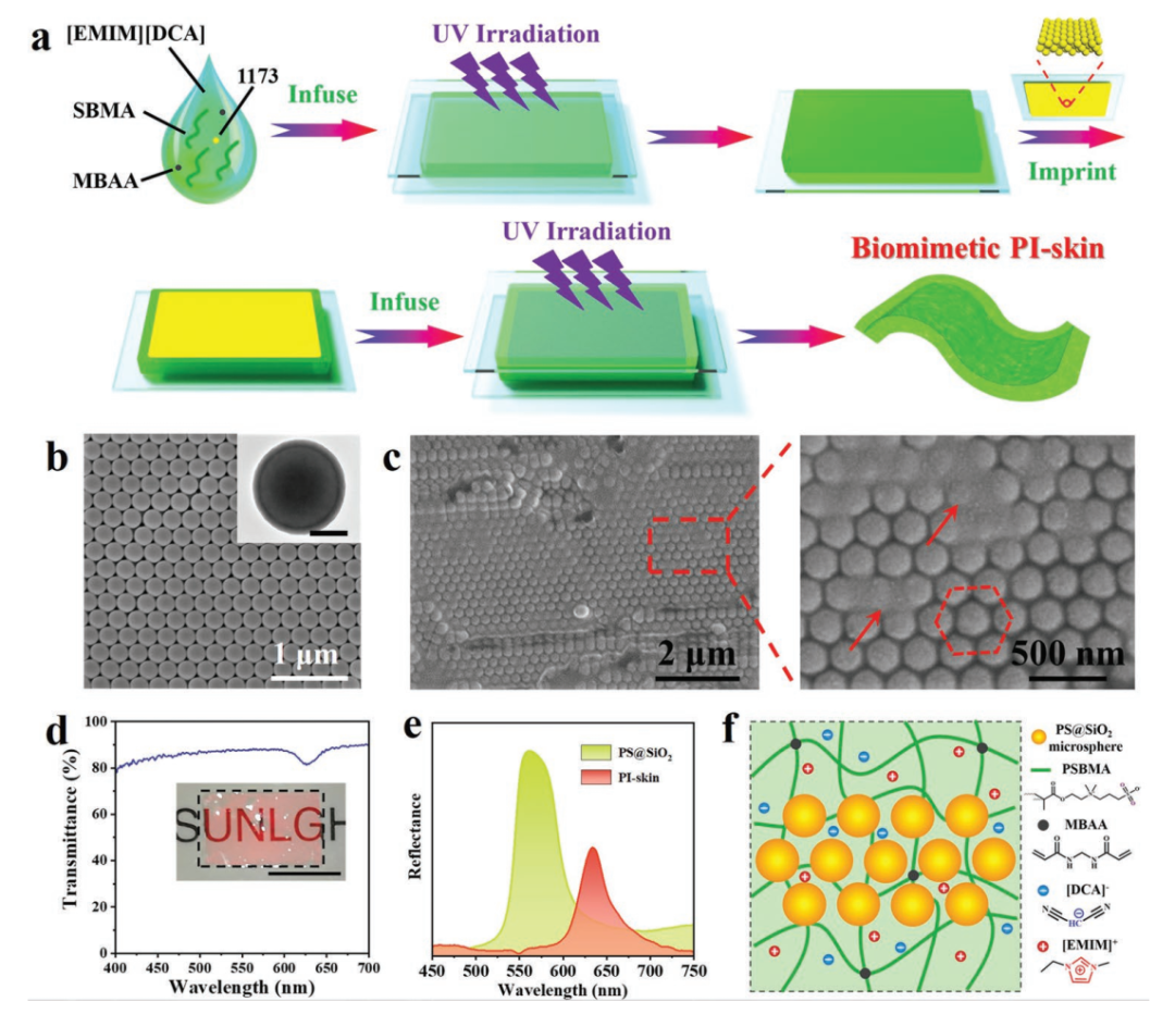 三步法制备仿生PI-skin。先将两性离子单体SBMA、交联剂和光引发剂溶解在离子液体1-乙基-3-甲基咪唑二氰胺([EMIM][DCA])中,得到无色透明前驱体,第一次光聚合制备单层离子凝胶。随后通过压印将预组装的237 nm的PS@SiO2微球PC模板转移到单层离子凝胶上。最后用前驱体填充有序微球阵列,第二次光聚合制备具有夹层结构的PI-skin。微球被PSBMA共价交联网络锁定,反射波长峰值从560变为634 nm。离子凝胶和PS@SiO2微球之间的非共价相互作用能进一步牢固地固定微球,这可能是避免微球在拉伸过程中与聚合物基质分离的关键,从而赋予PI-SKIN机械变色特性。