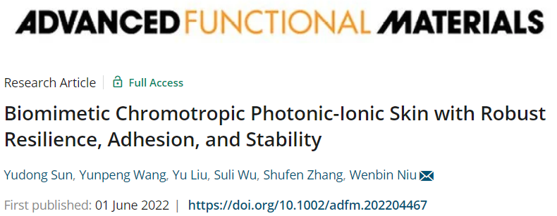 团队牛文斌教授团队受变色龙皮肤的启发,构建了一种新颖的仿生变色光子离子皮肤(PI-skin)。通过调整光子晶体(PC)的晶格间距,PI-skin表现出与电同步响应的敏感结构色变化(机械变色灵敏度:1.89 nm/%,Δλ>150 nm)。多两性离子网络提供了丰富的静电相互作用,赋予PI-skin优异的附着力、环境耐受性和出色的机械稳定性(>10000次连续循环)。同时,IL的高负载量削弱了多两性离子分子链之间的静电相互作用,导致高弹性。最终将PI-skin应用于构建视觉交互的可穿戴设备,实现了精确的人体运动监测、远程通信和压力分布的视觉定位。该研究以题为“Biomimetic Chromotropic Photonic-Ionic Skin with Robust Resilience, Adhesion, and Stability”发表在最新一期的《Advanced Functional Materials》上。