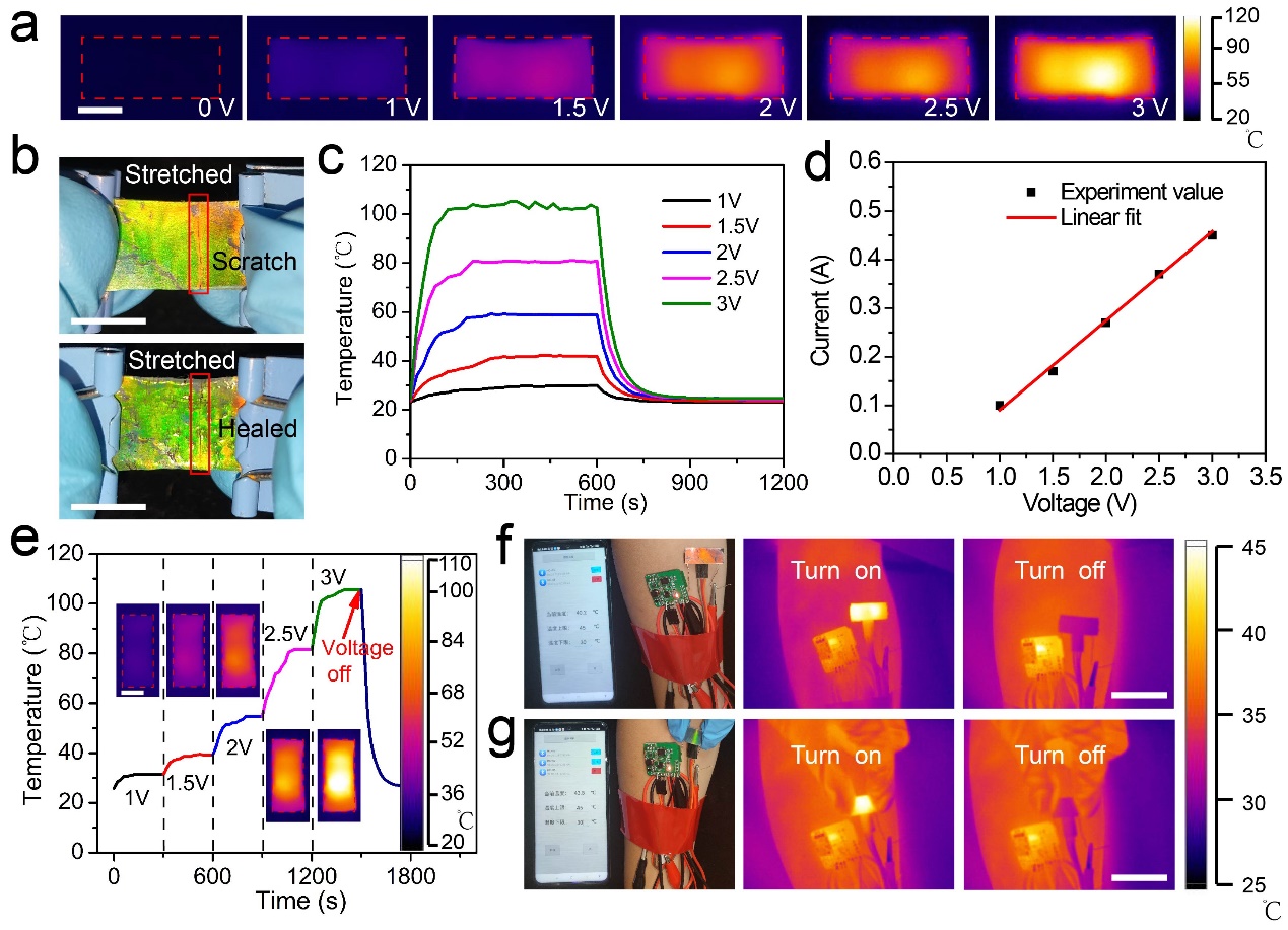 基于上述高效稳定的电热性能,将光子vitrimer-碳纳米管薄膜与蓝牙模块和控制芯片集成,制备了力致变色柔性无线热管理(MFW)器件。MFW器件具有快速的热响应、优异的力致变色性能、精准的温度控制、高效的电加热性能和低驱动电压(3V时饱和温度为103℃)。而且在被切割自愈合后仍保持其电热性能(105℃,3V)。值得注意的是,当样品被拉伸时,该装置保持了良好的电热性能,在机械变形条件下(6%、14%、17%、28%、34%)运行时电加热性能稳定。