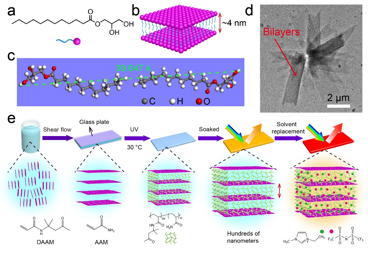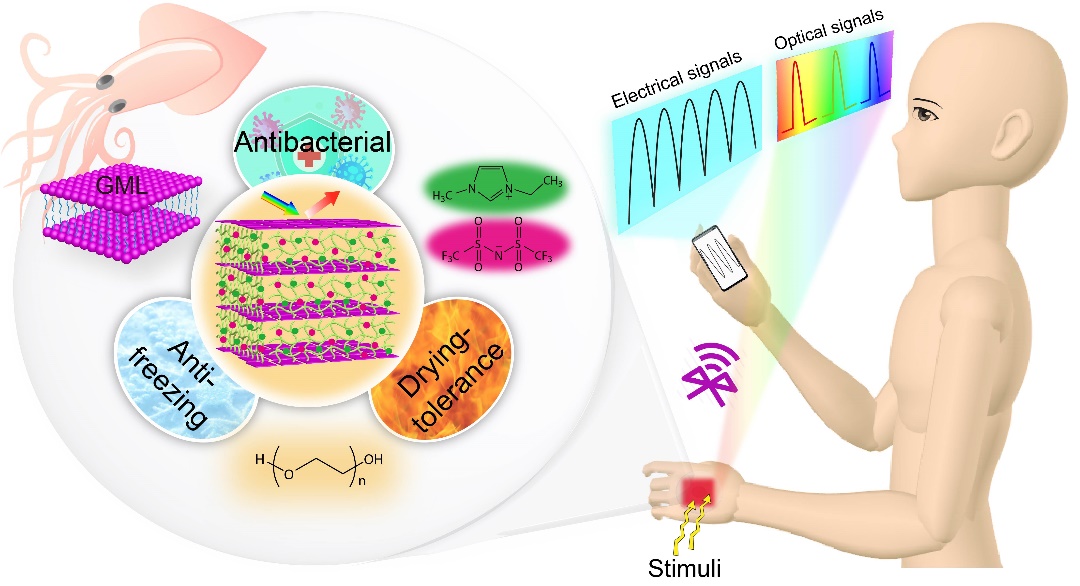 鱿鱼利用体内反射蛋白层次组装为光子纳米结构,与入射光发生物理作用反射特定光波,在视觉上呈现虹彩色。通过模拟这种结构,利用安全高效广谱的抗菌剂-月桂酸甘油酯自组装,模拟类鱿鱼的光子纳米结构,设计了一种可高效杀菌、抵抗恶劣环境的多功能交互式光子-离子皮肤,并联合无线传感模块,实现了对多重刺激的数字化/可视化感知。以“Squid-Inspired Photonic-Ionic Skin with Anti-Freezing, Drying-Tolerance, and Antibacterial Abilities for Wirelessly Interactive Multi-Sensing”发表于《Chemical Engineering Journal》上。文章第一作者原为大连理工大学化工学院博士生王云朋,现毕业任职于河南大学材料学院,通讯联系人为团队牛文斌教授。