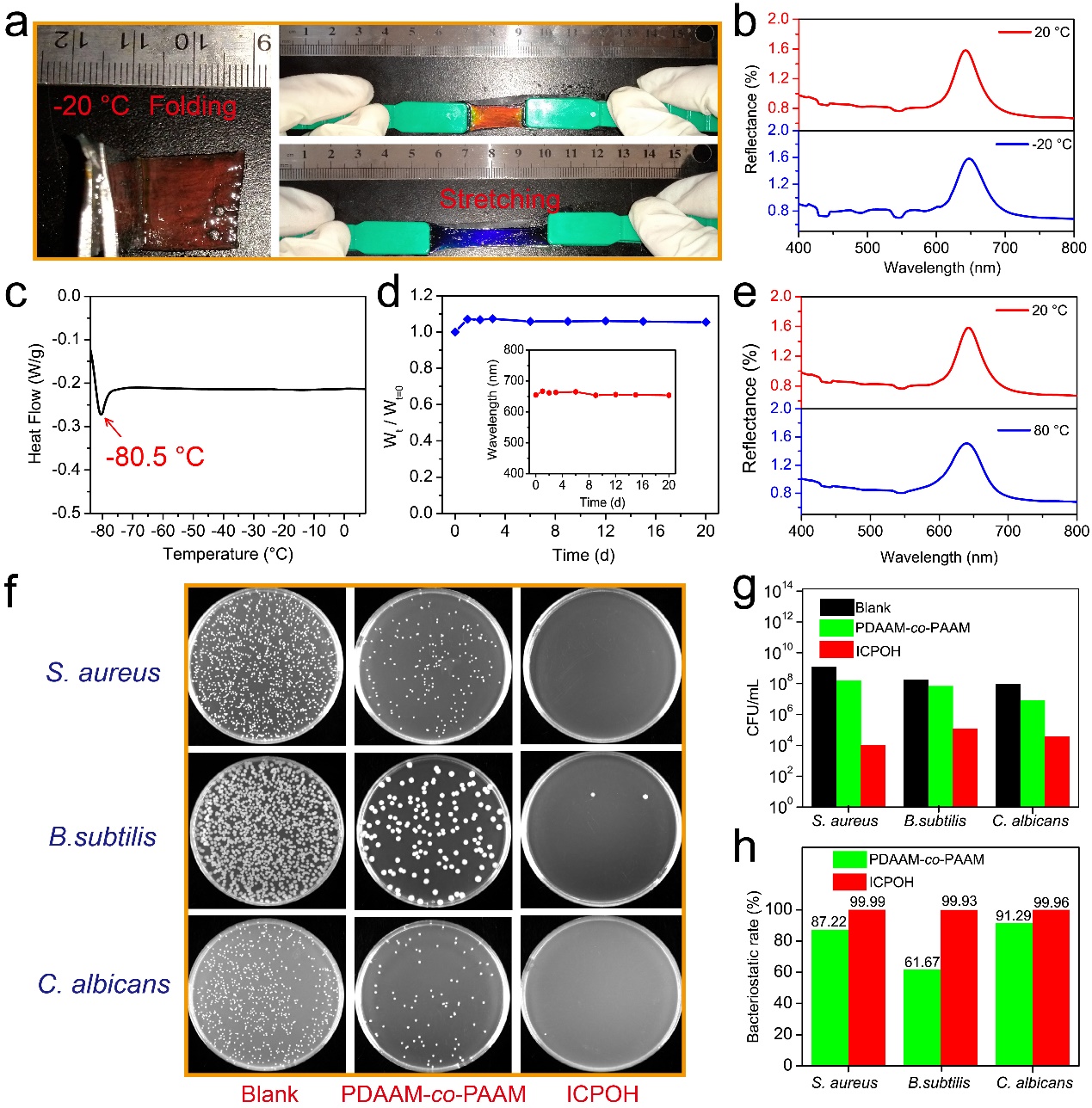该工作将表面活性剂分子月桂酸甘油酯GML自组装成带有双分子层胶束,然后以周期性堆叠的形式嵌入到基于化学交联的水凝胶基质当中构成光子纳米结构,得到光子水凝胶。然后再通过溶剂置换引入有机溶剂和导电离子液体,构筑离子-导电皮肤(PIskin)。由抗菌分子制成的纳米结构不仅能产生类似于鱿鱼皮肤的结构色,还能有效杀死金黄色葡萄球菌、枯草芽孢杆菌(革兰氏阳性菌)和白色念珠菌(真菌),抑菌率均大于99.9%。有机水凝胶基质的设计使PIskin具有长期的稳定性(>20 d),同时承受高温(80℃)和低温(-80.5℃),扩展了可视化传感的工作温度范围。